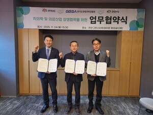 충남도가 그동안 추진해 온 선제적 3단계 초광역 협력을 완성하면서 천안시가 국립치의학연구원 최적지임을 다시 한번 입증했다.도는 24일 천안시 그린스타트업타운에서 천안시, 경기도경제과학진흥원과 국립치의학연구원 천안 설립 및 치의학산업 육성을 위한 초광역 협력 업무협약(MOU)을 체결했다고 밝혔다.이번 협약은 치의학산업의 연구개발, 실증, 인증·평가, 사업화가 지역별로 분산된 구조적 한계를 해소하고, 천안을 중심으로 한 전국 유일의 치의학 전주기 산업 기반을 마련하기 위해 추진했다.협약에 따라 각 기관은 △디지털 덴티스트리 분야 공동