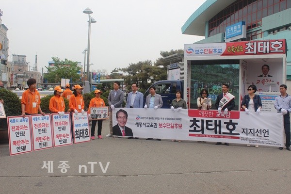 ‘대한민국애국시민연대’(상임대표 이상훈 전 국방장관)는 6월 1일 조치원역 광장에서 세종시교육감 최태호 보수단일후보 지지 선언을 하고 성명서를 발표했다.