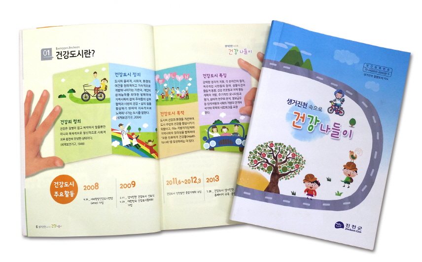 ‘생거진천 속으로 건강나들이’는 건강도시란, 자연환경, 나들이길, 체육․운동시설, 우리동네 건강생활, 도서관․복지시설, 건강한 먹거리 등 7개 분야와 함께 건강스트레칭과 자전거 안전수칙을 담은 부록으로 구성했다.