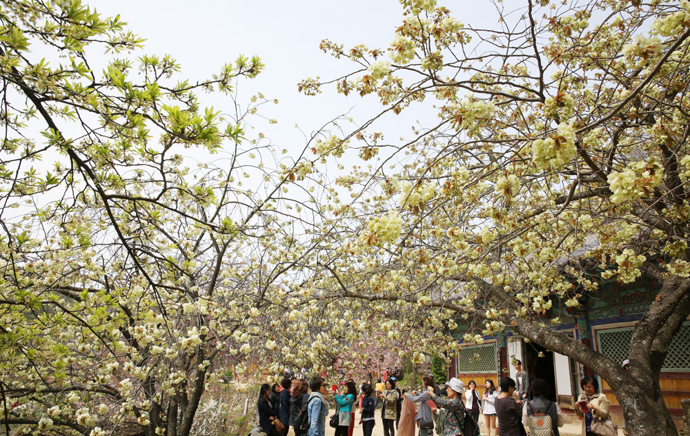 개심사 왕벚꽃은 다른 지역보다 보름 정도 늦은 4월 말에서 5월 초에 피는데 올해는 봄철 이상 고온으로 1주일 이상 일찍 꽃이 폈다.