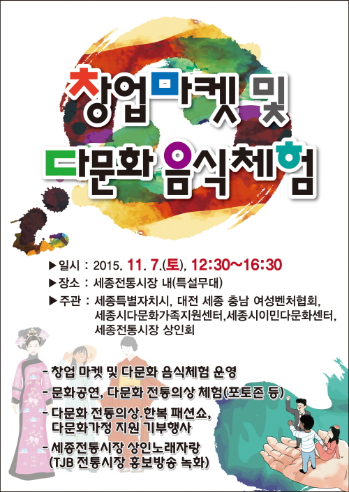 다문화센터, 세종전통시장 상인회가 공동 주관하는 이번 행사는 창업 마켓 11개와 다문화가정여성들이 전통음식을 판매하는 다문화 음식체험장 5개를 운영한다.